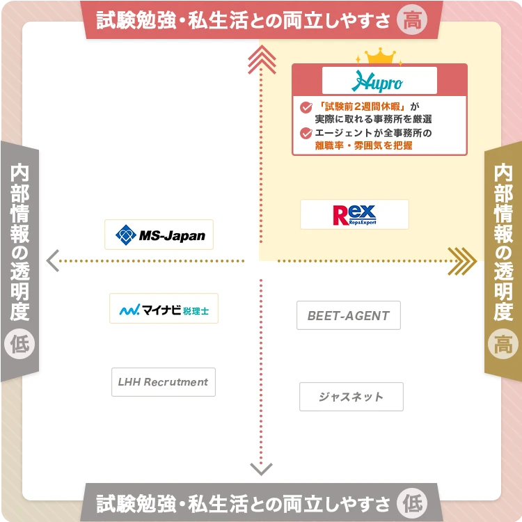 前職場の労働環境が整っていなく、資格獲得とキャリアアップを図るため転職開始。厳しい条件をアドバイザーに言いましたが結果複数事務所を紹介していただき無事理想に近い事務所に転職いたしました。