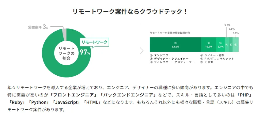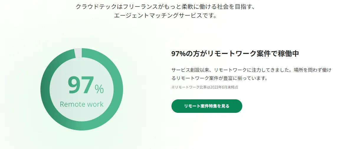 クラウドワークス テックはフリーランス向けのエージェントサービスであり、保有している97%の案件がリモートワークに対応しています。
