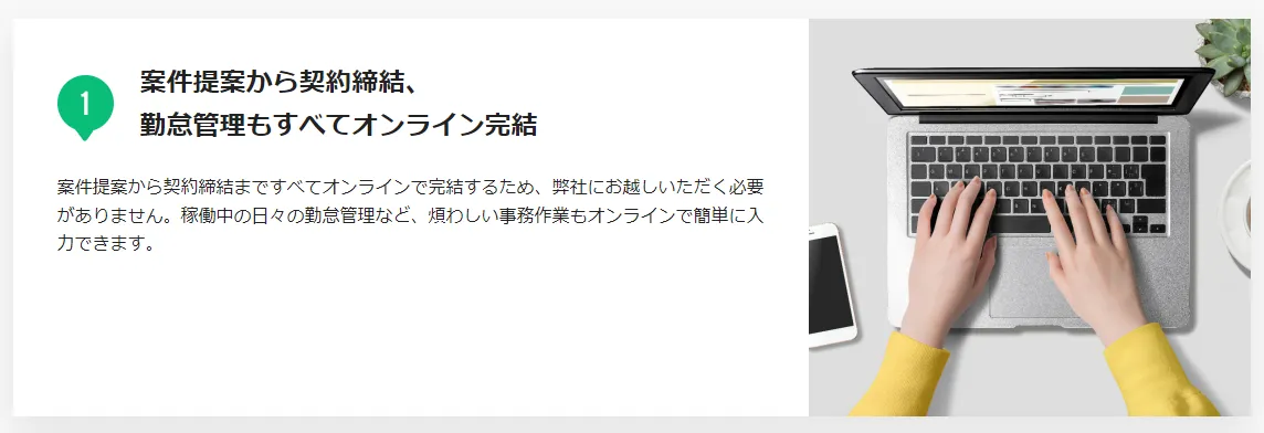 また、案件従事後の日々の勤怠管理や事務作業に関しても、すべてオンラインで完結するため、サービスに慣れてないうちからの稼働でも安心できると言えますね。