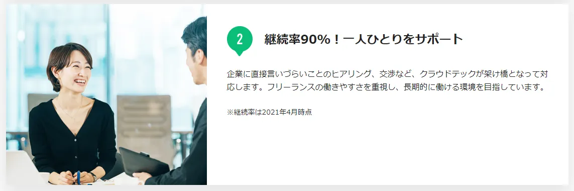 クラウドワークス テックの案件継続率は90%であることから、フリーランス一人ひとりの悩みや相談を聞いてくれる環境が整えられていると言えます。/p>