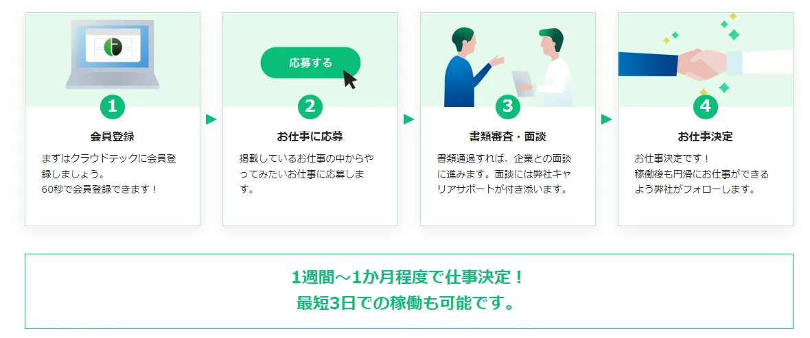 クラウドワークス テックは、案件の提案から契約締結まですべてオンラインで完結するため、案件を探し始めてから最短3日で稼働を開始できます。