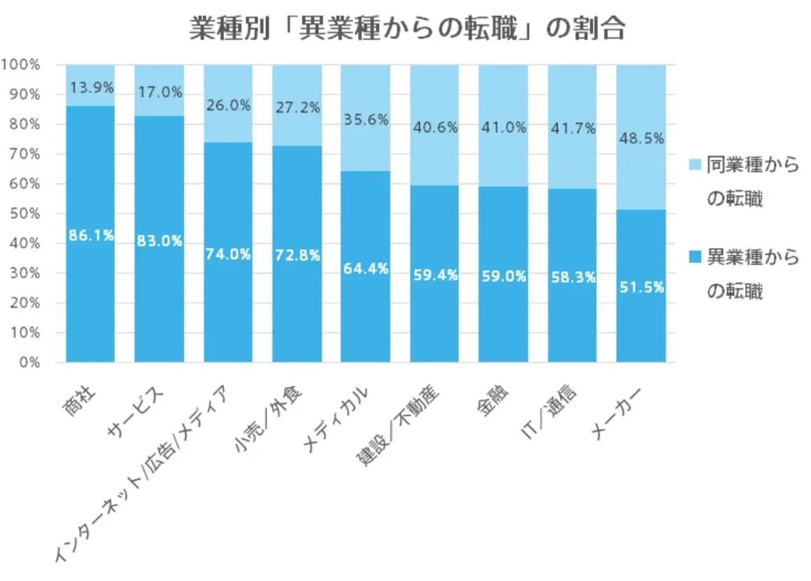 また、dodaのアンケート調査によると、「商社」「サービス」「インターネット/広告/メディア」では異業種からの転職割合が高い結果となっています。