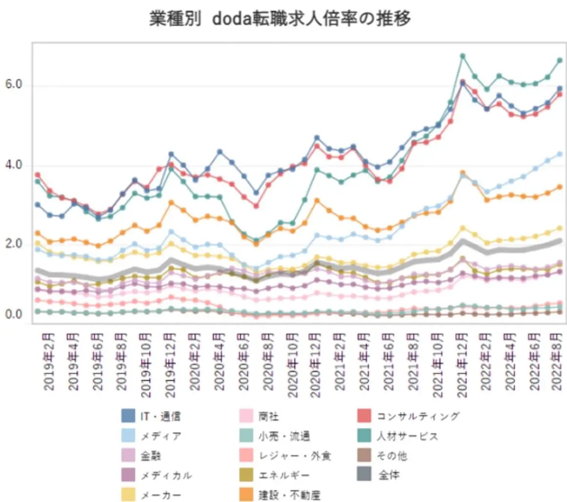 dodaの求人倍率は、年々増加している傾向にあります。求人倍率とは、求職者一人あたりの求人数のことです。