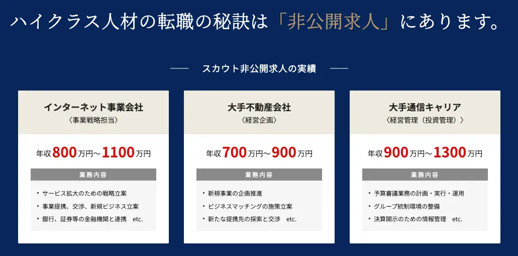 また、これまでに多くのハイクラス転職をサポートしてきた実績があることから、上場企業や外資系企業などとのつながりもあり、年収800~2,000万円の一般には公開されていない非公開求人も保有しています。