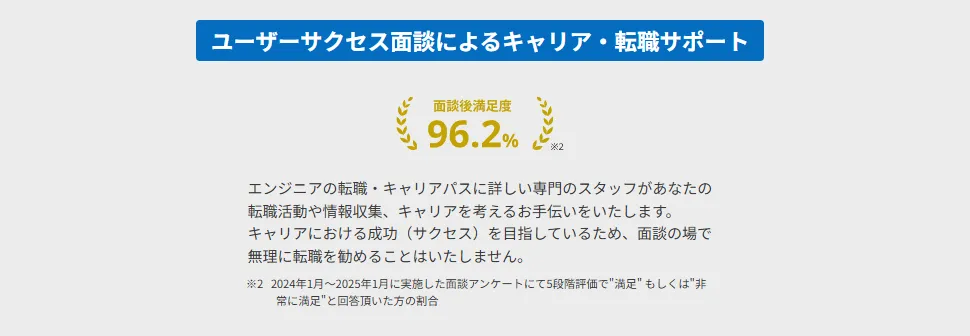 また並行して「ユーザーサクセス面談」も実施してくれ、技術知識のあるキャリアアドバイザーがあなたの転職活動をサポートしてくれますよ。