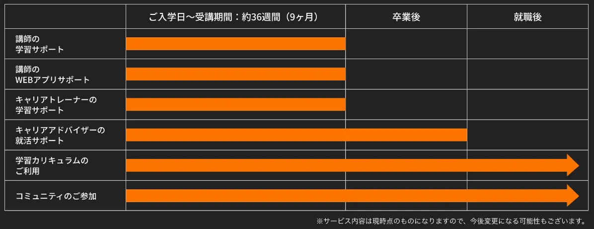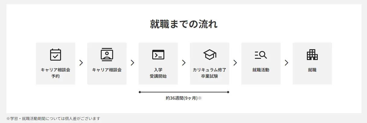 このようにRUNTEQは各種サポートが豊富のため、転職エージェントにあるような支援・サービスを受けながら、Webエンジニアとしてのキャリアの方向性を決めていけます。