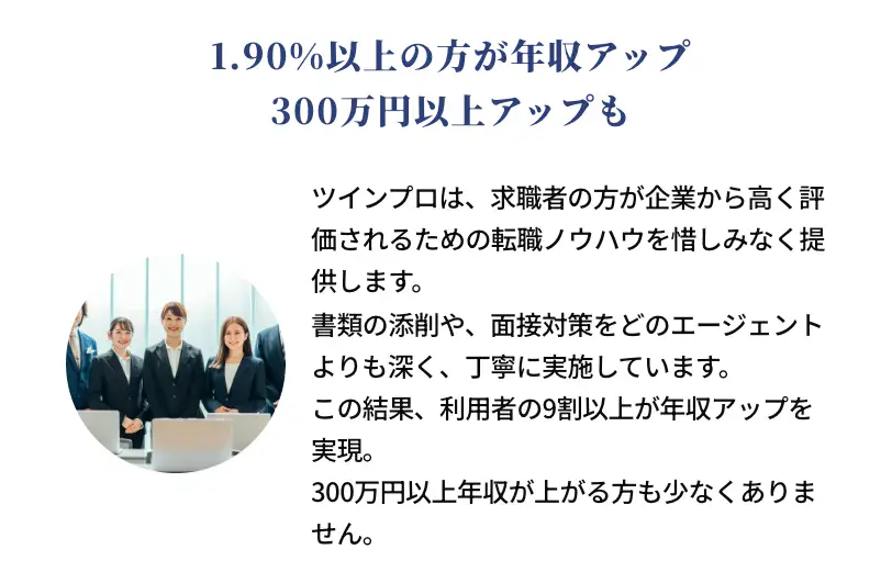 また年収アップ転職を実現させた方のなかには、年収が300万円以上上がったケースもあるため、本気で年収アップ転職を目指している方はツインプロに一度相談してみましょう。
