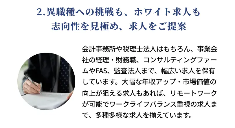 魅力的な求人を見つけられたら、志望企業に合わせた選考対策を実施してくれます。会計・財務領域に特化した選考対策で、あなたの内定獲得をしっかりとサポートしてくれるでしょう。