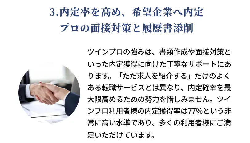 ほかにもツインプロは内定獲得率が77%であることや、大手企業求人も多く保有していることから、内定を獲得できなくて悩んでいる方や、大手企業への転職を目指している方にもおすすめできる転職サービスです。
