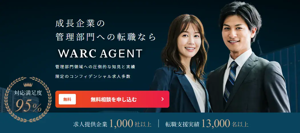 WARC AGENTは成長企業への支援を強みとし、累計13,000人以上の転職支援実績があり、紹介領域もCFOや経理財務など、経営管理部門中心です。